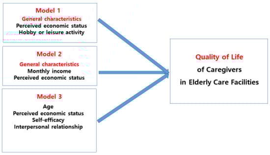 Meanwhile, one can consider the theory on quality of life by Ferrans et al. []. This is a model that integrates both biomedical and sociological perspectives, considering not only physical health but also overall aspects of life. The quality of life elements are evaluated based on biological functions, symptoms, functional status, health perception, personal, and environmental characteristics, and their causal relationships. Therefore, based on the research results related to the quality of life of caregivers in nursing hospitals and the model of Ferrans et al. [], this study included fatigue as a factor in the biological function, functional status, and general health perception of caregivers. Symptoms are mostly represented by the variable of depression, which is more common in women. As these are negative factors and have relevance to the quality of life, efforts to reduce fatigue and depression are necessary. Furthermore, job-related stress can adversely affect the quality of life, so the variable of job stress should be considered and its level reduced. Mediating and buffering factors include personal characteristics like self-efficacy [] and environmental characteristics like interpersonal relationships []. Enhancing caregivers’ self-efficacy and establishing harmonious human relationships can facilitate their job performance and improve the quality of life [,].