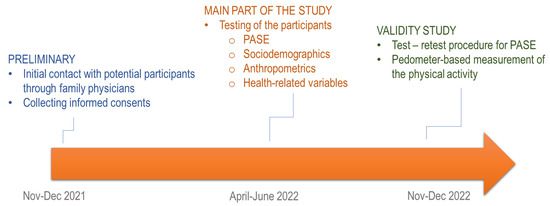 Participants in this study were persons older than 65 years (+65 years) from Bosnia and Herzegovina, and Croatia. The total sample comprised 211 participants (101 females), of whom 111 were community-dwelling residents (age: 71.11 ± 3.11 years) and 110 were nursing home residents (72.22 ± 4.01 years of age; t-test = 0.91, p > 0.05). Participants were contacted directly by their personal medical doctor 5–6 months before the initiation of the study (December 2021) and were asked to participate in the study, which was planned for spring 2022. The main part of the study was performed during the COVID-19 pandemic, when certain prevention and social distancing measures remained in place, although there was no strict lockdown in the studied countries. Specifically, face masks were mandatory in all health institutions (including nursing homes), and public transport, nursing home visits were limited, and visitors were health-checked, while social distancing of 1.5 m in public places was mandatory. Altogether, 360 invitations were sent, and 224 of the invited individuals responded positively. The final sample (n = 211) did not include those who died in the meantime (four persons) and/or changed their place of residence (six persons). A subsample of 61 participants tested in the main part of the study was included in the validity study, which was completed during November and December 2022 (please see below for details). The study was conducted in accordance with the Helsinki declaration and was approved by the Ethical Committee of the Faculty of Kinesiology, University of Split, Croatia. The study design and testing are presented in Figure 1.