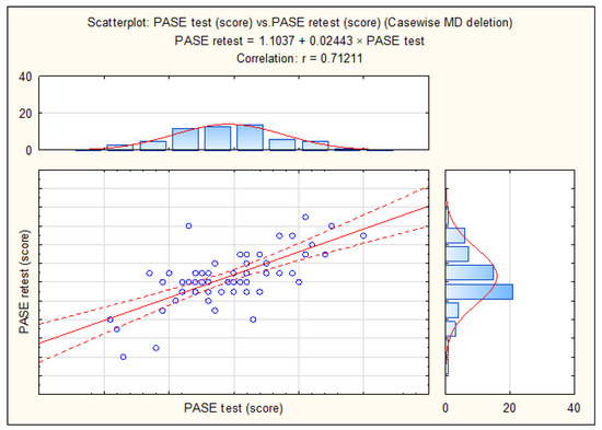 The test–retest reliability of the PASE was appropriate, with a correlation of 0.71 (Figure 2).