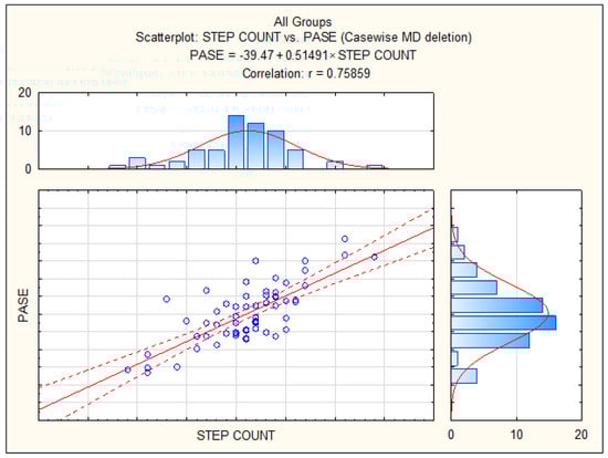 Correlations between objectively measured physical activity level (number of steps per day) and Physical Activity Scale for the Elderly (PASE) for the total sample.