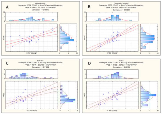 Correlations between objectively measured physical activity levels (number of steps per day) and Physical Activity Scale for the Elderly (PASE) for nursing home residents (A), community-dwelling residents (B), females (C), and males (D).