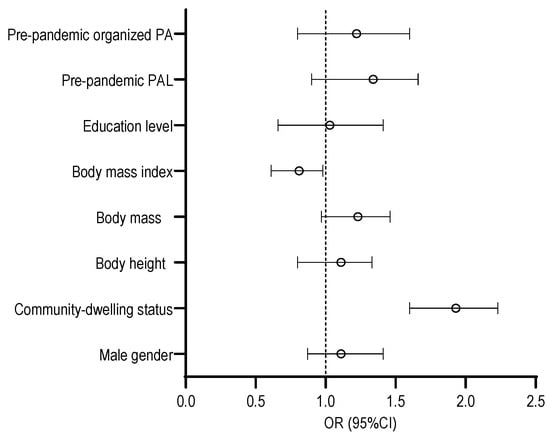 The association between the studied sociodemographic, health-related, and anthropometric indices (predictors) and binarized PAL (criterion) was checked by calculating a series of logistic regressions. Previous studies evidenced that the primary limiting factor for PALs is a poor health status [35], which is additionally and logically correlated with age. Therefore, in the preliminary statistical processing, we checked the correlations between the age and health status (evaluated using SF-12_PCS, and SF-12_MCS) and the PALs of our participants. Since the correlations were strong (please see Results for details), the participants’ age and health status were included as covariates in all subsequent logistic regression calculations. In the first phase, we checked associations between all predictors and PALs. Since the analysis on the total sample evidenced a significant association between the participants’ residential status and PALs (please see below for details), in the second phase, all logistic regressions were stratified according to residential status (e.g., calculated separately for community-dwelling and nursing home residents). The odds ratios (ORs) with corresponding 95% confidence intervals (95% CIs) were reported, and Statistic aver. 13.5 (Tibco Inc., Palo Alto, CA, USA) was used for all statistical analyses.