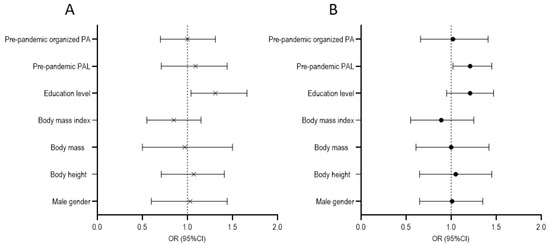The correlation analyses showed a strong correlation between the SF-12 scores and the PASE (Pearson’s R = 0.81 and 0.86 for SF-12_MCS and SF-12_PCS, and PASE, respectively; p < 0.001), showing the strong association between PALs during the pandemic period and the generic patient-reported measure of health status. Also, the PALs obtained using the PASE were significantly correlated with the participants’ age (Pearson’s R = 0.71; p < 0.001). Therefore, when further calculating the logistic regressions, the SF-12_MCS, SF-12_PCS, and participants’ age were systematically controlled for confounding effects (e.g., included as covariates).