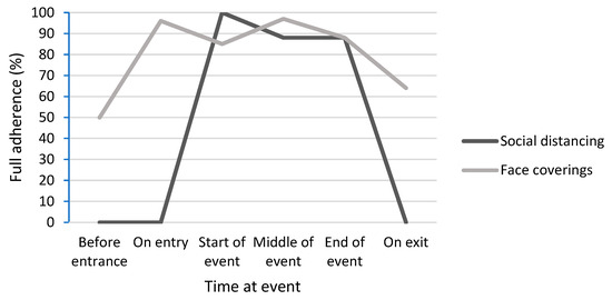 19], and practiced making judgements about distance between individuals prior to the study. Adherence to mask wearing was defined as an individual wearing a mask (irrespective of design) which fully covered the mouth and nose (i.e., over the nose, under the chin) of the individual. The independent variables included the context within the venue (e.g., entry/exit, toilets, food/drink provision), environmental influences (e.g., signage, floor markings), staff and people (e.g., staff behaviors), time (e.g., changes in behavior across different time-points), and event management (e.g., cohorting of attendees).