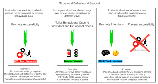 Figure 2 provides a framework which balances individual responsibility in decision-making with adaptations to overarching systems and environments to make the ‘safe’ behavior the easiest, or most likely. Without additional support, it is likely that pre-existing habits and intuitive responses, as well as social cues such as norms, will predominate [