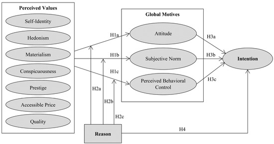 Unlike the previous behavioral intention models, BRT suggests that the ability to predict intentions improves with the addition of reasons. Firstly, reasons activate the justification and defense mechanisms, which were not addressed by the behavioral intention models. Essentially, reasons can impact intention, as individuals tend to feel more confident when they have reasons to justify their behavior, even if their global motives may not quite align with their intentions. Secondly, further research has proven that there is a direct relationship between context-specific factors and intention. Context-specific factors that are ignored by traditional structures are captured through reasons. This finding aligns with the theory proposed by Davis et al. [91], which suggests that not all connections in behavioral intention models may become active in certain situations. Gigerenzer and Goldstein’s [92] research has also shown that reason-based decision-making serves as a shortcut for determining choices in real-life decision situations. Consequently, context-specific reasons that the consumer develops to justify his/her jewelry purchasing behavior and to justify his/her action may directly affect the intentions. The following hypothesis is proposed:
