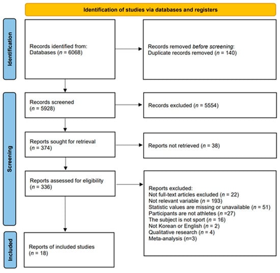 Eight databases—Google Scholar, ProQuest, PubMed, Scopus, RISS, KISS, Kyobo Scholar, and DBpia—were used to search for 6068 papers. Duplicate papers (n = 140) were excluded, and after reviewing the titles and abstracts, the remaining papers (n = 374) were selected for an in-depth review. Details are presented in the PRISMA flow chart (Figure 1). A meta-analysis was performed on 18 studies.