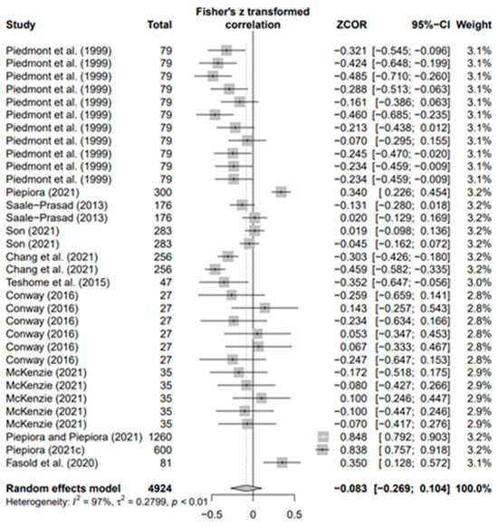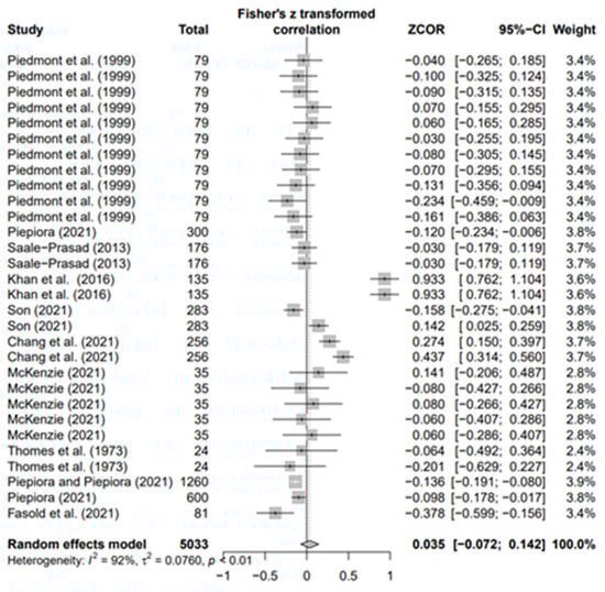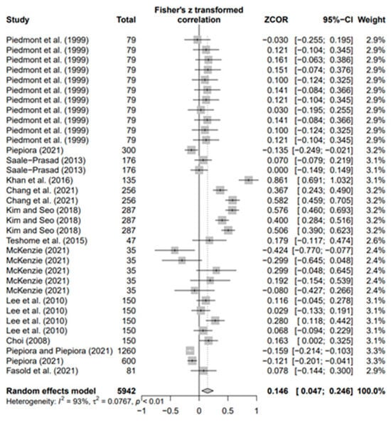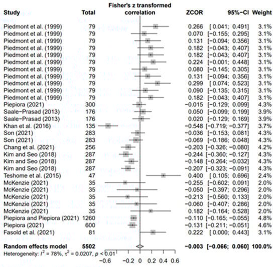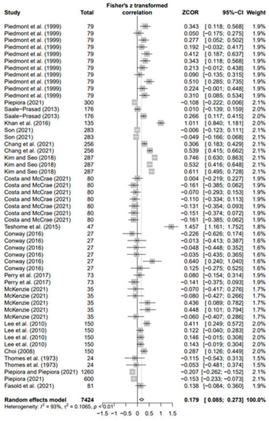 The data values (k = 180) of the 18 selected papers were converted using Fisher’s Z value and meta-analyzed using the random-effects model to derive the average effect size of the third decimal digit. The overall ESr was 0.073 (95% confidence interval [CI]: 0.021–0.124; p < 0.01). Moreover, in the result of each five personality, ESr was −0.083 (95% CI −0.269; 0.104, p = 0.3) for neuroticism (N) (k = 33), −0.003 (95% CI-0.066; 0.060, p = 0.9) for agreeableness (A) (k = 30), 0.035 (95% CI −0.072; 0.142, p = 0.5) for openness (O) (k = 30), 0.179 for conscientiousness (C) (k = 53; 95% CI 0.085; 0.273, p < 0.001), and 0.146 (95% CI 0.047; −0.246, p < 0.01) for extroversion (E) (k = 34). Only C (p < 0.001) and E (p < 0.01) were statistically significant, with effect sizes smaller than the median of Cohen’s [] effect size criteria. This means that conscientiousness and extroversion in various sports help athletes achieve higher performance levels. Regarding the heterogeneity of each group, groups N ( = 97%), A ( = 78%), O ( = 92%), C ( = 93%), and E ( = 93%) had the highest values.