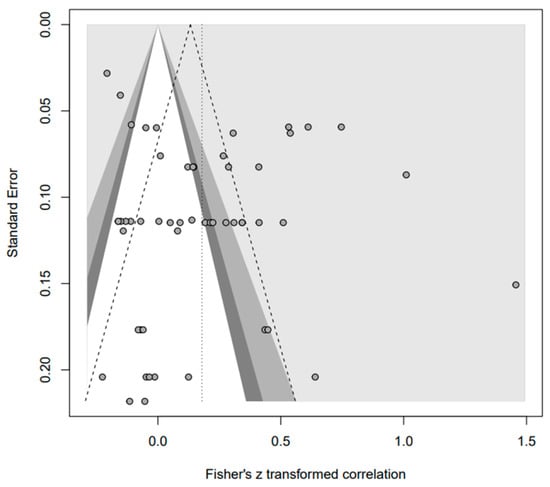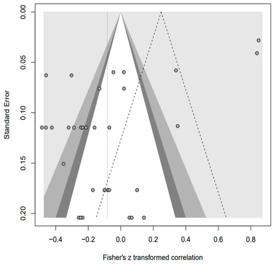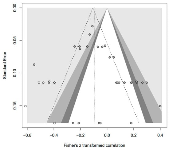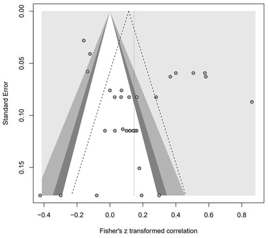 Moderator analysis, performed to verify heterogeneity, was a categorical variable; thus, a meta-ANOVA was performed. Publishing bias occurs because of the lack of appropriate research for the topic of meta-analysis, and the results of each study cannot be applied []. Therefore, for the publication bias test, to determine the asymmetry of the data selected for this study, a funnel plot was used to determine whether the visual effect size was symmetrical. In addition, statistical analyses, Egger’s regression tests, and trim-and-fill tests were performed.