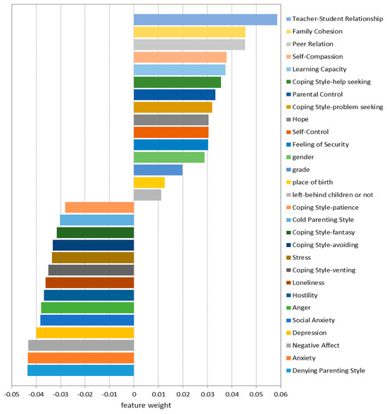 In our study, 22 individual features varied widely in importance. Negative affect and anxiety were the crucial predictors (score = 0.043), ranked 4th and 5th, respectively. Depression, self-compassion, anger, social anxiety, and hostility also occupied crucial positions (score = 0.038/0.037). Except for self-compassion, the other positive features ranked lower in importance: security scored 0.03, self-control scored 0.03, and hope scored 0.03. Demographic variables scored low in feature importance: Gender scored 0.029, grade scored 0.02, place of birth scored 0.013, and left-behind children or not scored 0.011.