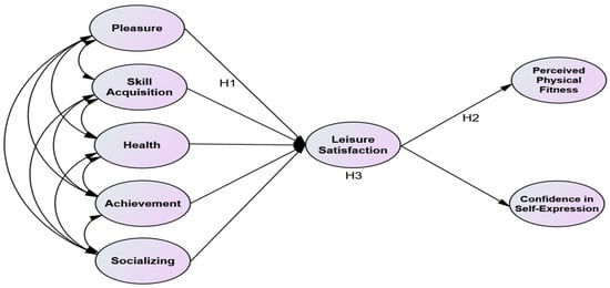 Leisure satisfaction is a positive emotion resulting from leisure activities [38]. Previous studies have suggested that satisfaction obtained from interactions with others, such as sports or leisure activities accompanied by physical activity, can be linked to physical health and confidence in interpersonal relationships [27]. Self-efficacy increases confidence and work effectiveness in daily life and is an important factor that ultimately affects quality of life [33]. The following hypothesis was presented based on the findings of previous studies: