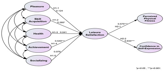 The verification of Hypothesis 1 was partially accepted. Among the subfactors of participation motivation in sports climbing, only skill acquisition and achievement positively affected leisure satisfaction. The verification of Hypothesis 2 was accepted. Leisure satisfaction positively affected physical self-efficacy. The verification results of Hypotheses 1–2 are presented in Table 6. Figure 2 illustrates the validated model of Hypotheses 1–2.