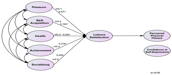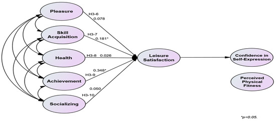 Satisfaction obtained from interactions with others, such as sports or leisure activities accompanied by physical activity, can be linked to physical health and confidence in interpersonal relationships [27]. Self-efficacy represents a strong sense of self-confidence and a factor that influences the achievement of desired results [36]. Based on the findings of previous studies, the following hypothesis was established to verify the mediating effect of leisure satisfaction on the relationship between participation motivation in sports climbing and physical self-efficacy: