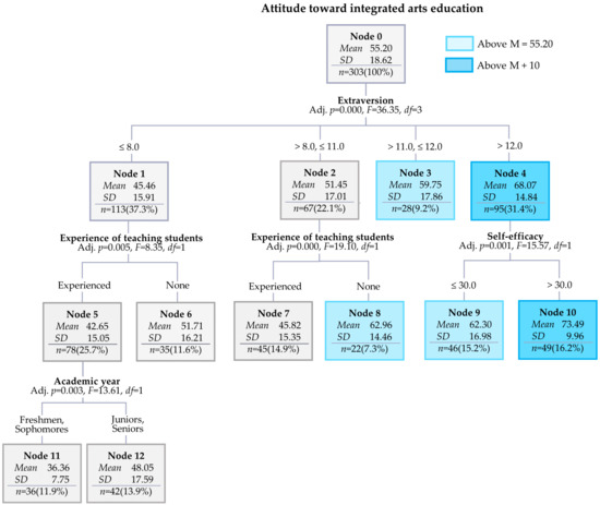 The average score for attitudes toward integrated arts education of the 67 participants with extraversion scores of eight and eleven or less was 51.45, which was slightly below the average (Node 2). However, participants with some experience teaching students in their major had a relatively high average score of 62.96 for their attitudes toward integrated arts education (Node 8). Furthermore, participants with extraversion scores of 12 had an average score of 42.65 for their attitudes toward integrated arts education, which is slightly above the overall average (Node 3).