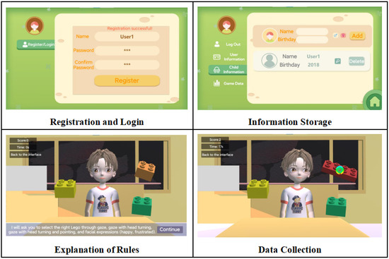In this study, we designed a virtual game consisting of the following modules: (1) user registration and login module—for the registration of participants’ basic information, such as their name, birth date, and gender; (2) information storage module—to save participants’ basic information; (3) game rule introduction module—where a virtual character introduces the game rules to the participants; (4) data collection module—to record and save information on participants’ game scores, time, and eye-tracking data. The name of this virtual game was “LEGO Puzzle”, and Figure 1 shows the interfaces of the game’s relevant modules, including the types of cues, the image of the virtual character, and the LEGO elements. The virtual character provides participants with three types of cues: “gaze” (hereinafter referred to as Cue 1), “gaze with head turn” (hereinafter referred to as Cue 2), and “gaze with head turn and finger pointing” (hereinafter referred to as Cue 3), as shown in Figure 2. These cues are presented to participants in a random order during the game. The choice of gaze cues was made due to their proven importance as social signals, which can convey information about the social characteristics of observers, as supported by Dalmaso et al. (2020) [35]. Similarly, head turns and pointing gestures were selected because they are known to effectively shape attention, influencing the direction and focus of an observer’s attention [36]. The basis for selecting these cues lay in their proven relevance in social cognition, particularly in the context of ASD, where the integration and interpretation of such cues are often impaired.