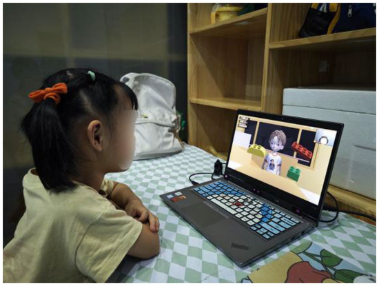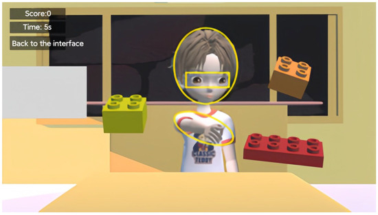 The virtual game was presented on a computer with a screen resolution of 1920 × 1080 pixels using the Unity software (version 2022.1.20f1c1). During the experiment, we used the Tobii Eye Tracker 5 from the Tobii Company in Stockholm, Sweden, to record the eye movement data of the participants while they were playing the virtual game. The eye tracker was an external device that was connected to a laptop through a USB interface to collect and record the participants’ eye movement data in real time. This eye tracker had a sampling frequency of 90 Hz and a gaze angle of 40 × 40 degrees. The experimental scene is shown in Figure 2.