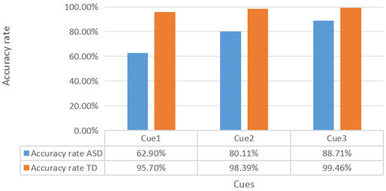 There were significant differences in the game scores among the ASD group children under different cue conditions. The average score under Cue 3 was the highest (4.125), while the average score under Cue 1 was the lowest (2.925). This trend is further supported by the change in the accuracy rates shown in Figure 5, where the accuracy rate of ASD children under Cue 3 is the highest.