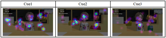 Furthermore, we conducted a detailed analysis of ASD children’s preferences for specific cue types. By dividing the eyes, head, and finger pointing into AOIs, we analyzed the gaze durations for these AOIs under the three cue types and generated gaze heatmaps (Figure 6). We observed that children with ASD exhibited the longest gaze duration for the AOIs under Cue 3, exhibiting a higher visual attention bias, which supports the notion that increasing the diversity and salience of cues can improve their visual attention and engagement [45]. These findings suggest that children with ASD may benefit from intervention measures that gradually increase the complexity of social stimuli, starting from basic cues and progressively transitioning to more complex social interactions.