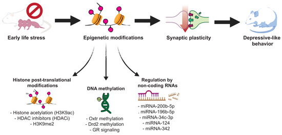 Thus, the aim of this review is to explore how ELS can alter neuroplasticity through epigenetic modifications and eventually lead to depression. To accomplish this, we will search for the most recent findings on the topic and structure them based on the main epigenetic mechanisms involved, exploring the two main forms of neuroplasticity (i.e., structural and functional synaptic plasticity). The former includes morphological changes (e.g., changes in the shape and number of dendrites and dendritic spine), as well as neurogenesis [41], while the latter consists of pre- and post-synaptic modifications, which may result in long-term potentiation (LTP) or long-term depression (LTD) of synaptic transmission [42,43].