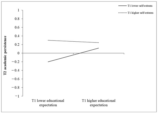 Based on the expectancy–value theory [14,24], educational expectations are supposed to be positively correlated with adolescents’ academic persistence. Related research using cross-sectional data supports this assumption [19]; the greater the educational expectation, the greater the behavioral efforts toward academic achievements [25]. Our findings are consistent with this theory and extend related empirical evidence, showing that educational expectations are positively correlated not only with current but also with future academic persistence in a sample of rural adolescents. More importantly, as indicated by the results of the regression model, when self-esteem was added, self-esteem could directly predict an increase in academic persistence. Meanwhile, educational expectations positively predicted an increase in academic persistence at lower levels of self-esteem. As such, the effect of educational expectations on academic persistence were found to depend on the self-esteem of rural adolescents. In particular, this study reveals that self-esteem complements educational expectations that, together, benefit future academic persistence in the context of rural families. When educational expectations are low, high self-esteem can protect rural adolescents from the effects of such low educational expectations, maintaining greater future academic persistence. When self-esteem is low, educational expectations can positively predict rural adolescents’ future academic persistence.