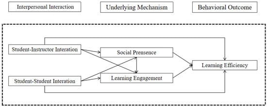 Overall, effective interaction patterns not only facilitate communication but also enhance the feeling of being part of a cohesive group, thereby promoting a more engaging and productive online learning experience. Empirical evidence has consistently illuminated the mediating role of social presence. Studies have demonstrated that heightened social presence, catalyzed by rich interactions, correlates with improved student engagement, satisfaction, and more efficacious learning outcomes [16,56,67,68,69]. Based on prior theory and empirical studies referenced above, it is reasonable to infer that social presence may mediate the association between interaction and learning efficiency.