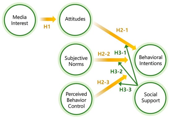 In addition to attitudes, subjective norms, and PBC, social support has been recognized as a critical element that can enhance an individual’s intention to engage in certain behaviors. Jeong and Kim [] explored the role of social support in fostering the intention to continue exercising, demonstrating that various forms of social support—emotional, informational, and instrumental—can significantly strengthen individuals’ intentions. However, the interaction between social support and the traditional predictors of behavioral intention—such as attitudes, subjective norms, and PBC—has not been thoroughly examined. It is plausible that social support can serve as a moderating factor, enhancing the positive effects of attitudes, subjective norms, and PBC on behavioral intentions. For instance, when individuals perceive strong social support, the influence of their positive attitudes, the perceived social pressures (subjective norms), and their confidence in performing the behavior (PBC) on their intentions might be amplified. Conversely, in the absence of adequate social support, these influences might be weaker.