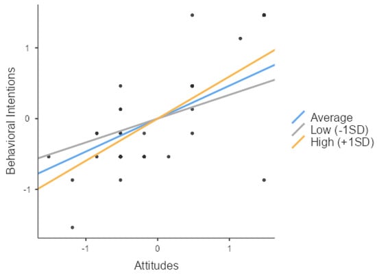 As hypothesized in H3-1, attitudes (Z = 12.33, p < 0.001) and social support (Z = 10.96, p < 0.001) significantly impacted the behavioral intentions. Furthermore, their interaction (Z = 3.52, p < 0.001) also had a significant effect on the behavioral intentions, thus validating H3-1. The independent variable, the moderator, and their interaction all exhibited positive effects, indicating an enhancing influence. Consequently, a simple slope analysis was conducted to explore the variations in the slope between the independent and dependent variables across the three levels of the moderator: low (mean −1 SD), average, and high social support (mean +1 SD). Ultimately, the analysis indicated that social support significantly influenced the behavioral intentions across all three groups (low, average, and high social support) (respectively, Z = 4.92, p < 0.001; Z = 12.10, p < 0.001; Z = 18.47, p < 0.001).