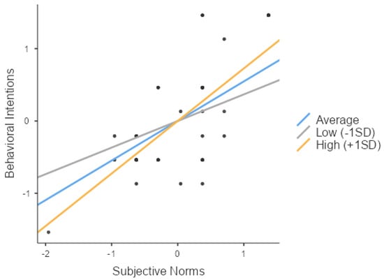 Similarly, as hypothesized in H3-2, subjective norms (Z = 15.98, p < 0.001) and social support (Z = 9.57, p < 0.001) significantly impacted the behavioral intentions. Furthermore, their interaction (Z = 6.14, p < 0.001) also had a significant effect on the behavioral intentions, thus validating H3-2. The independent variable, the moderator, and their interaction all exhibited positive effects, indicating an enhancing influence. Consequently, a simple slope analysis was conducted to explore the variations in the slope between the independent and dependent variables across three levels of the moderator: low (mean −1 SD), average, and high social support (mean +1 SD). The analysis indicated that social support significantly influenced the behavioral intentions across all three groups (low, average, and high social support) (respectively, Z = 15.32, p < 0.001; Z = 7.13, p < 0.001; Z = 17.61, p < 0.001).