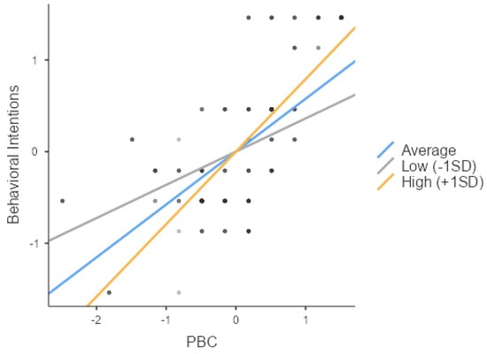 Next, as hypothesized in H3-3, PBC (Z = 19.59, p < 0.001) and social support (Z = 7.00, p < 0.001) significantly impacted the behavioral intentions. In addition, their interaction (Z = 10.39, p < 0.001) had a significant effect on the behavioral intentions, thus validating H3-3, and the independent variable, the moderator, and their interaction all exhibited positive effects, indicating an enhancing influence. A simple slope analysis was performed to explore the variations in the slope between the independent and dependent variables across the three levels of the moderator, i.e., low, average, and high social support. The analysis confirmed that social support significantly influenced the behavioral intentions across all three groups (low, average, and high social support) (respectively, Z = 18.11, p < 0.001; Z = 9.20, p < 0.001; Z = 20.60, p < 0.001).