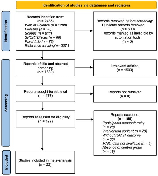 In November 2023, after summarizing keywords from previous reviews [10,11,12] and discussions, we ultimately determined the search strategy used to retrieve relevant studies using various databases, including PubMed, Web of Science, Scopus, SPORTDiscus, and PsychInfo (via EBSCO). Following the population, intervention, comparison, outcomes, and study design (PICOS) approach, the search strategy included participants, interventions, and study types. The search criteria included full-text availability, publication date, and language (Appendix A). The reference lists of the included studies were manually reviewed to identify additional suitable studies.