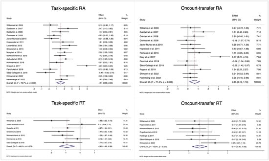 For transfer RA, there were medium-sized effects for both adult (ES = 0.63, 95% CI = [0.29, 0.98], I2 = 0.0%) and adolescent (ES = 0.58, 95% CI = [−0.65, 1.82], I2 = 88.7%) groups, with no significant heterogeneity between them (p = 0.939).