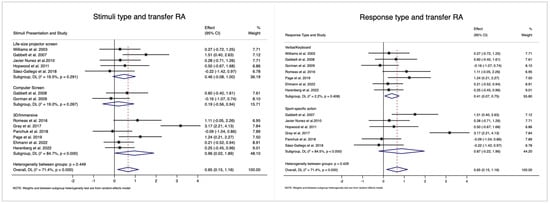 It is universally acknowledged that participants’ responses to stimuli may also influence the transfer effect. For transfer RA, the ES was small (ES = 0.41, 95% CI = [0.07, 0.75], I2 = 2.2%) when participants’ verbal responses were required; however, there was a large effect (ES = 0.87, 95% CI = [−0.22, 1.96], I2 = 84.5%) when sports-specific action responses were required. However, no significant heterogeneity was observed among the different response types (p = 0.429).