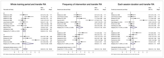Figure 5 (left side) indicates that studies with longer training periods had a larger effect on transfer RA (≤4 weeks: ES = 0.38, 95% CI = [0.01, 0.74], I2 = 22.8%; >4 weeks: ES = 1.25, 95% CI = [−0.16, 2.65], I2 = 87.8%) but the difference was not significant (p = 0.241). For each session (Figure 5, middle section), the effect was medium for both shorter (<20 min: ES = 0.56, 95% CI = [0.01, 1.11], I2 = 42.8%) and longer (>20 min: ES = 0.72, 95% CI = [−0.10, 1.54], I2 = 81.8%) durations. For the training frequencies (Figure 5, right side), the ESs were similar for both groups (<3 sessions/week: ES = 0.72, 95% CI = [−0.10, 1.54], I2 = 81.8%, ≥3: ES = 0.56, 95% CI = [0.01, 1.11], I2 = 42.8%).