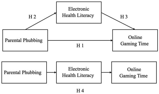 As seen in the above, no research has proven the direct and indirect relationships between parents’ phubbing behavior and children’s online gaming time. Hence, the purpose of this study is to explore the relationship between parents’ phubbing behavior and children’s online gaming time. More importantly, we investigate the mediating role of electronic health literacy in this association. Accordingly, we propose the four hypotheses presented in Figure 1: