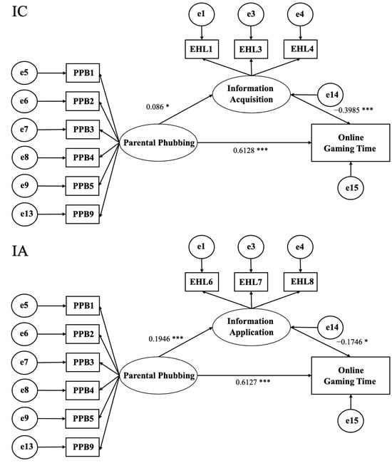 As shown in the path coefficient in Table 3, we can see that parental phubbing behavior is positively and significantly correlated with adolescents’ information acquisition and positively and significantly correlated with adolescents’ information application. Parental phubbing behavior is positively correlated with the amount of time adolescents spend playing online games every week. Adolescents’ information acquisition and information application are negatively correlated with their weekly playtime for online games.