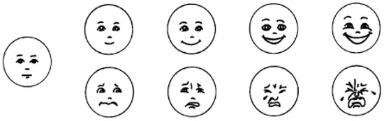 We utilized the Facial Affect Scale [46] to assess children’s emotion ratings. This scale comprises nine consecutive facial expression illustrations, ranging from significantly sad to progressively happy, and the score is −4 to 4, with 0 representing a neutral emotional state. Experimental illustrations are depicted in Figure 1. The experimenter showed the children how to rate their emotions using the Facial Emotions Scale and asked the children to demonstrate how to use the scale. (For example, “How do you feel inside when your mom takes you out to play?/What do you feel inside when your toys get broken?”).