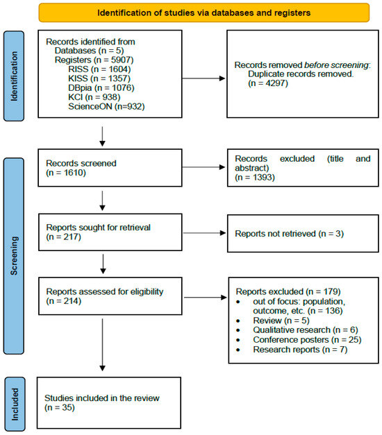The total number of studies found in the database search was 5907 (1604 from RISS, 1357 from KISS, 1076 from DBpia, 938 from KCI, and 932 from ScienceON). Of these, the number of studies remaining after removing duplicate literature was 1610, with 4297 redundant papers in each database. After the exclusion of 3 studies for which the original text could not be found when reviewing all the databases together, 1607 studies remained. The final 35 studies were selected after removing 1572 studies by applying the selection and exclusion criteria again (Figure 1).