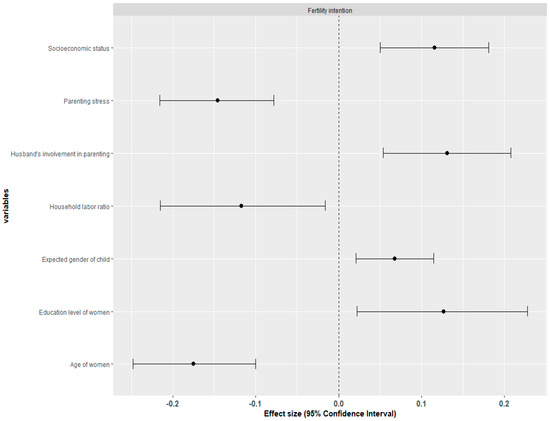 To enhance the reliability of the study and the statistical significance of the results, the effect sizes of correlations were analyzed based on variables that included at least three studies, out of 35 papers that presented correlations with fertility intentions [24]. A meta-analysis of the effect sizes of factors influencing fertility intentions revealed that the husband’s involvement in parenting (ESr = 0.131), women’s education level (ESr = 0.127), socioeconomic status (SES) (effect size = 0.116), and the expected gender of the child (effect size = 0.068) showed statistically significant positive effects. Conversely, women’s age (effect size = −0.175), parental stress (effect size = −0.146), and household labor ratio (effect size = −0.117) showed statistically significant negative effects. On the other hand, factors such as marital satisfaction, maternal employment rate, marital conflict, emotional value of children, gender equality awareness, education level of men, self-efficacy, self-esteem, perception of parental responsibility, income, instrumental value of children, childcare expenses burden, depression of mother, and child-rearing expense income ratio (CEIR) did not significantly influence fertility intentions (Table 3, Figure 2).