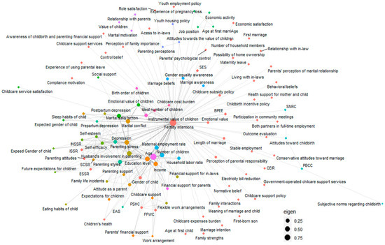 Figure 3 presents a network graph showing the eigenvector centrality of factors identified as predictors of fertility intention for Koreans. Eigenvector centrality demonstrates the importance of factors identified as predictors of fertility intention. It integrates both the frequency of relationships with variables significant to fertility intention and the connectivity with other related factors [29]. Therefore, the size of the node indicates the core factors influencing fertility intention. The interconnecting lines between variables represent statistically significant correlations. This network visualization provides a comprehensive overview of all variables demonstrating a significant impact on fertility intention, synthesized from 35 distinct studies. Among the 109 predictor variables of fertility intention, several factors stood out. These include age, husband’s involvement in parenting, number of children, education level, income, parenting styles, parenting support, gender of the child, maternal employment rate, marital satisfaction, marital conflict, parenting stress, self-efficacy, self-esteem, instrumental value of children, and child cost burden.
