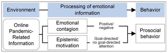 In addition to emotional contagion, motivation processing is another critical dimension of information reception. Previous research has primarily explored the causes of prosocial behavior from the perspectives of altruistic motivation [24] and social exchange motivation [25,26]. However, these motivations are stable patterns shaped by social and familial influence, and they are not enough to express the impact that sudden environmental changes (such as pandemics) have on individuals’ behaviors. Instead, EASI believes that individuals with epistemic motivation can intentionally focus deeply on outside information, affecting how they make decisions [13]. Thus, it follows that deliberate attention directed to online pandemic information may, likewise, impact peoples’ decisions to engage in prosocial behavior. Studies have also shown that if individuals reduce their attention directed to negative information, or change their cognition, they will be conducive to the generation of empathy [27,28]. Thus, it can be inferred that although healthcare students may struggle to avoid negative online information about the pandemic, they can lessen their deliberate attention to it. This may help mitigate the decline in prosocial behaviors driven by negative emotions.