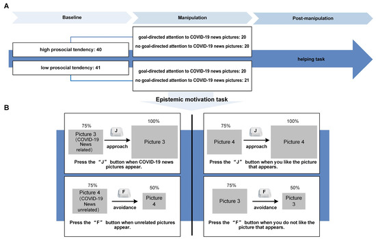 The manipulation of epistemic motivation was realized by the approach/avoid task [39,40]. All pictures were initially displayed to fill 75% of the screen. Participants in the goal-directed task were asked to press the “J” button to “approach” the COVID-19 picture when they saw it, causing the picture to enlarge to 100% of the screen within 3 s. Participants were then asked to visualize themselves approaching the scene as if it were real. In the no-goal-directed task, participants were asked to press the “J” button to “approach” the picture when they liked it, and to press the “F” button to “avoid” the picture when they did not like it (see Figure 3B).