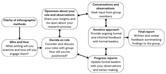 First, researchers and practitioners should consider the strengths and limitations of ethnographic methods and how they could best support their leadership research. Next, they should consider an appropriate setting for their research and reflect on how they might engage that group. Here, once a researcher is engaged with a group, they could follow a continuous cycle while collecting data. Researchers should be clear about their role within the team, but be conscious of the capacity (and need) to adapt this in the course of the immersion. For example, a researcher might initially take a more passive role as they observe the group dynamics. Then, as they gradually build rapport with the group, they might take on more active roles and participate in team activities.
