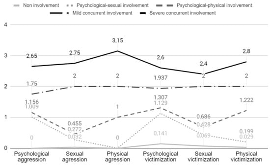 The five-class model allowed us to differentiate between the following groups of involvement: the first group (n = 406) showed scores of near to zero in terms of aggression in the three types of violence, low levels of victimization in psychological violence (0.14), and very low levels of sexual (0.07) and physical violence (0.03). For these characteristics, it was labelled the “non-involvement” group. The second category (n = 102) presented the highest scores in involvement in psychological and sexual violence, with medium–low values in both aggression (1.01 and 0.27, respectively) and victimization (1.13 and 0.43, respectively) and was labelled the “psychological–sexual involvement” group. The third category (n = 31) presented significantly higher rates of psychological and physical violence, both in aggression (1.16 and 1.00, respectively) and in victimization (1.21 and 1.22, respectively) and was labelled the “psychological–physical involvement” group. The fourth category (n = 20) was termed the “mild concurrent involvement in violence” group and was characterized by high mean scores in aggression (between 1.75 and 2.00) and victimization (between 1.94 and 2.00) in all types of violence. The last group (n = 16) was analogous to the previous one, but with even higher scores (between 2.65 and 3.15 in aggression and between 2.40 and 2.80 in victimization) and was labelled the “severe concurrent involvement in violence” group (see Figure 1).