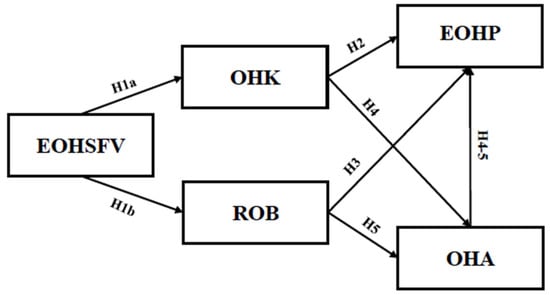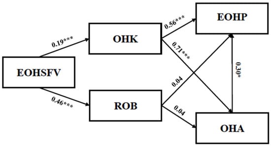 The serial mediation hypotheses (Hypotheses 4 and 5) were tested using the Hayes PROCESS macro (model 6). Results for the first serial mediation model indicated that EOHSFV had a positive effect on OHK (β = 0.18, t = 7.11, p < 0.001). OHK had a positive effect on OHA (β = 0.71, t = 18.18, p < 0.001) and EOHP (β = 0.35, t = 4.22, p < 0.001). In addition, OHA positively predicted EOHP (β = 0.30, t = 3.90, p < 0.01), and the serial mediation effect was significant (β = 0.04, t = 11.42, p < 0.01, 95% CI [0.01, 0.10]). Thus, Hypothesis 4 was supported. The results of the second serial mediation model indicated that EOHSFV had a positive effect on ROB (β = 0.44, t = 11.33, p < 0.001). However, ROB showed an insignificant effect on OHA (β = 0.04, t = 1.15, p > 0.05) and EOHP (β = 0.02, t = 0.61, p > 0.05). In addition, OHA positively predicted EOHP (β = 0.51, t = 8.73, p < 0.001), but the serial mediation effect was not significant (β = 0.01, t = 10.41, p > 0.05, 95% CI [−0.01, 0.03]). In conclusion, Hypothesis 4 was supported, while Hypothesis 5 was not. Table 3 provides a summary of the hypotheses and hypothesis testing results. Figure 3 presents the standardized coefficients and significance for each path in the hypothesized model.