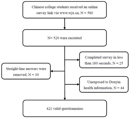 Of the 580 potential respondents who received the survey link, a total of 520 participants completed the survey. To avoid biased sampling, non-probability sampling techniques were excluded. Following the methods of previous studies [], a three-step data-cleaning process was implemented. First, 25 respondents were removed due to an insufficient survey completion time, defined as less than 180 s, also known as “speeders”. Second, 30 respondents were excluded for providing “straight-lined” answers. Finally, to ensure that respondents had been exposed to health-related information on Douyin, an initial filter question, “Have you ever been exposed to health-related information on Douyin?” was included. The enrollment procedure is shown in Figure 2.