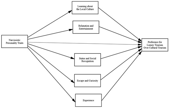 The existing literature on luxury travel consumer behavior often overlooks the impact of individual personality differences on travel preferences and motivations. Building on previous studies that suggest luxury travel serves as a means for self-enhancement—allowing travelers to create an idealized self-image and impress others through their lavish experiences [15,16]—the present study aims to address this gap. The aim of the present study was to examine the associations that narcissistic personality traits had with the preference for luxury tourism over cultural tourism, focusing on the role of travel-related motivations as potential mediators.