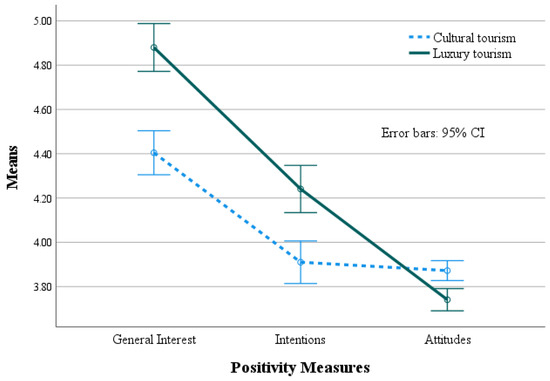 The results indicated a significant effect for the Type of Vignette (F [1,1341] = 15.29, p < 0.001), with significantly overall higher positive rates for luxury compared to cultural tourism. In addition, the significant effect obtained for the positivity measures (F [2,1341] = 520.11, p < 0.001) indicates significant differences in their levels, which were qualified by the significant Type of Vignette × Positivity Measures (F [2,1341] = 86.67, p < 0.001). As can be seen in Table 1, for luxury tourism, the interest and intentions are significantly higher than for cultural tourism, while the attitudes are higher for cultural tourism. This interaction is presented in Figure 2.