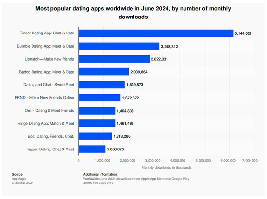 - Stoicescu, M. Social Impact of Online Dating Platforms. A Case Study on Tinder. In Proceedings of the 2020 19th RoEduNet Conference: Networking in Education and Research (RoEduNet), Bucharest, Romania, 11–12 December 2020; IEEE: Piscataway, NJ, USA, 2020; pp. 1–6. [Google Scholar]