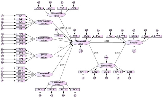 The gathering of questionnaire data comprised two components. The initial section gathered fundamental information regarding the customers, including gender, age, education level, and use of online dating platforms. The second section aligns with the research model and involves a total of nine variables: convenience value, information value, experiential value, social value, perceived risk, perceived cost, perceived value, satisfaction, and loyalty. All variables were derived from the previous literature to guarantee that the indicators were suitable for this study. Specifically, items for convenience value and information value were drawn from Ibáñez-Sánchez et al. [55,64,66,67,101]. Items of experiential and social value were sourced from the research by Zhong et al. [11,65,90,102]. Items of perceived risk and perceived cost were drawn from the study by Chen et al. [11,12,14,58,103,104]. Items for perceived value were sourced from the research by Singh et al. [67,86,102]. Items for satisfaction were derived from the research by Hsu et al. [12,105,106], while items for loyalty refer to Yuan et al.‘s study [11,101,106,107]. Each item was evaluated on a 7-point Likert scale, with options spanning from “1” for “strongly disagree” to “7” for “strongly agree”.