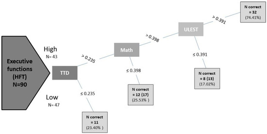 After exploring several ML techniques, the model that led to the best accuracy was a decision tree classifier (DTC) model, with the categorical HFT variable as the response variable [24]. Figure 1 presents the results of the chosen decision tree model, showing higher sensitivity for students with high EF than students with low EF. The trained model achieved an accuracy of 71%, precision of 70%, and recall of 82%. The classification scores revealed that the best features for distinguishing between the high- and low-executive-function (EF) groups are the combined performances in the TTD, math, and ULEST variables.